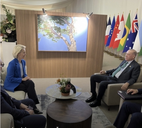 Cumhurbaşkanı Recep Tayyip Erdoğan, Güney Afrika'nın Johannesburg kentinde düzenlenen G20 Liderler Zirvesi'ndeki temasları kapsamında Avrupa Birliği (AB) Komisyonu Başkanı Ursula von der Leyen ile Johannesburg Expo Center'da görüştü.
