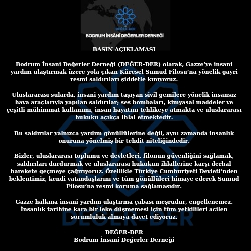 Bodrum İnsani Değerler Derneği (DEĞER-DER) olarak, Gazze’ye insani yardım ulaştırmak üzere yola çıkan Küresel Sumud Filosu’na yönelik gayri resmi saldırıları şiddetle kınıyoruz.